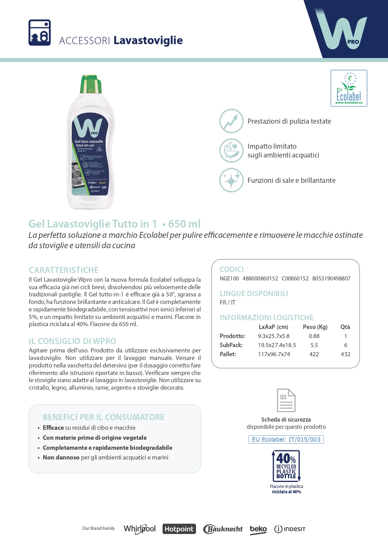 WPRO Gel Lavastoviglie Tutto in 1 • 650 ml ECOLAB PRODOTTO ECOLOGICO X 6 CONFEZIONI CODICE 488000860152 PROFESSIONAL